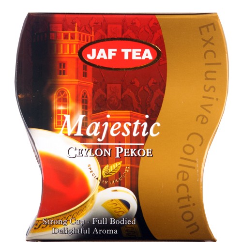 Листовий чай Majestic JAF TEA - це висококласний купаж чаю стандарту Pekoe (Пеко), зібраного з найкращих плантацій о. Цейлон. Настою глибокого бурштинового кольору властивий вишуканий повнотілий смак і складний аромат з яскраво вираженими квітково-медовими нотами. Благородний смак для будь-якої пори дня! Для любителів міцного чаю. Тип листа: Чистий чорний, чудово скручений.