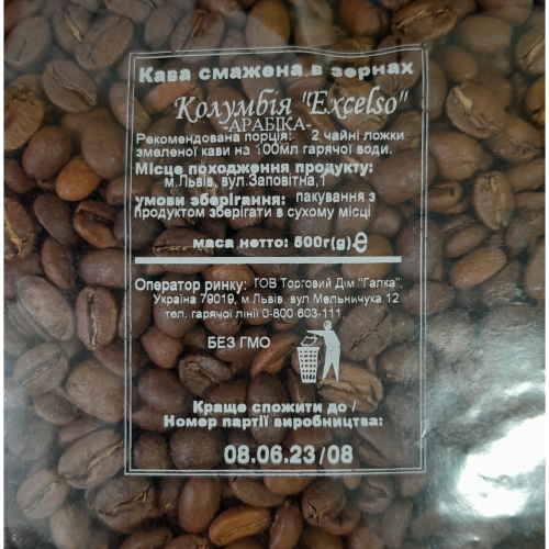 Кава Галка Колумбія Excelso 500г зерна в м'якій упаковці