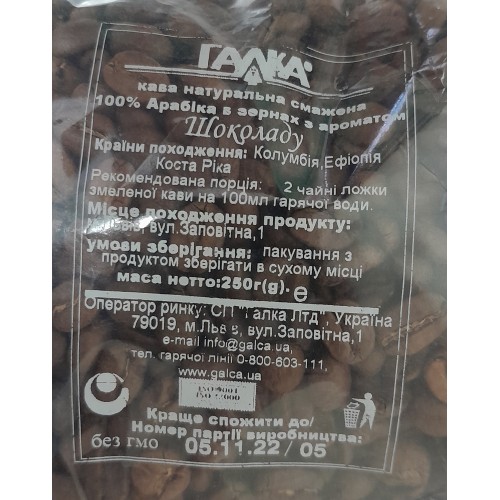 Кава Галка Шоколаду 250г зерна в м'якій упаковці